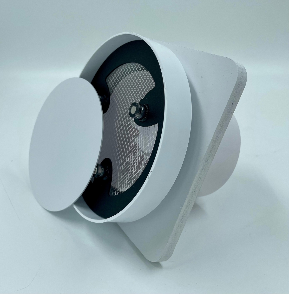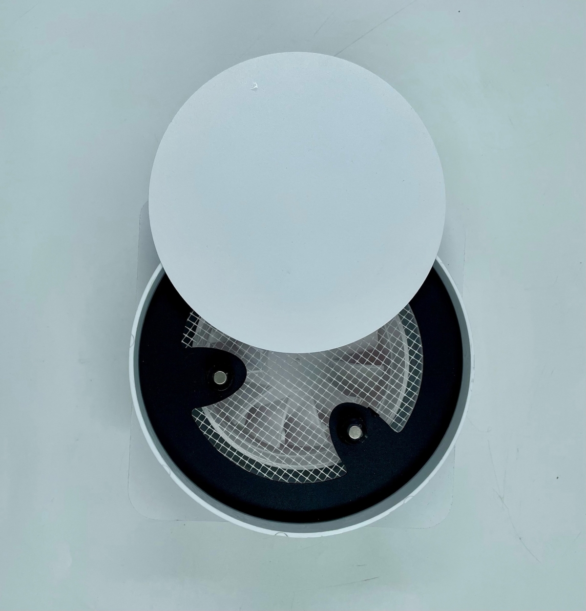 Решетки сделаны из высококачественного пластика и стали и покрашены в белый матовый цвет муар, который идеально сочетается с цветом и текстурой полотна потолка. Центральный диск держится на неодимовых магнитах.